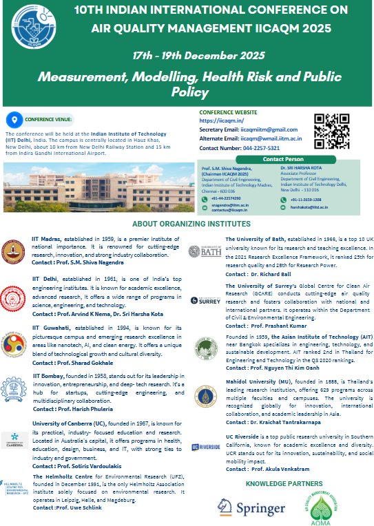 The 10th Indian International Conference on Air Quality Management (IICAQM 2025) will be held from 17th to 19th December 2025 at IIT Delhi, India. The conference focuses on critical themes such as measurement, modelling, health risk assessment, and public policy in air quality management. It will serve as a vital platform for scientists, engineers, educators, and policymakers to exchange innovative ideas, present research findings, and explore practical solutions to combat air pollution and its impacts on public health.