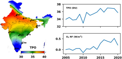 In recent decades, there has been a notable rise in scientific attention toward tropospheric ozone (O₃) due to its vital role in regulating the oxidative capacity of the atmosphere, its influence on air quality, and its adverse impacts. Over India, tropospheric ozone exhibits marked spatial and temporal variability, influenced by a complex interplay of anthropogenic emissions, biogenic sources, and meteorological factors. Understanding the spatiotemporal variability of surface ozone across India is particularly important, as it is one of the most harmful air pollutants, and comprehensive scientific assessments on these aspects remain limited. Although several studies have investigated surface ozone at specific sites, a thorough evaluation of the vertical and horizontal distribution of tropospheric ozone over India is still lacking. This presentation focuses on investigating the spatiotemporal variability of tropospheric ozone over the Indian subcontinent through the integration of ground-based and satellite observations along with reanalysis datasets. This approach aims to provide improved insights into the underlying trends and drivers of ozone variability, thereby enhancing our understanding of its implications for regional air quality and climate interactions. We also present an analysis on the tropospheric ozone variations associated with Rossby Wave Breaking events from a climatological perspective.